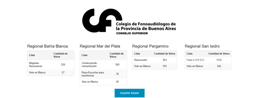 Las y los matriculados de las Regionales Bahía Blanca, Mar del Plata, Pergamino y San Isidro emitieron su voto electrónico a través del sistema de autogestión entre los días 24 y 26 de septiembre. Los resultados fueron: