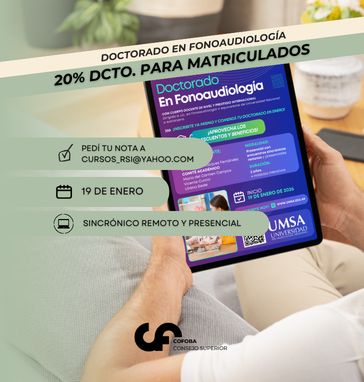 El Consejo Superior del Colegio de Fonoaudiólogos de la Provincia de Buenos Aires informa que, en el marco del convenio vigente entre el Colegio y la Universidad del Museo Social Argentino (UMSA), las y los profesionales matriculados al día (2025) pueden acceder a un 20 % de descuento sobre el valor de la cuota correspondiente al Doctorado en Fonoaudiología, cuya nueva cohorte inicia el 19 de enero de 2026. Esta propuesta...
